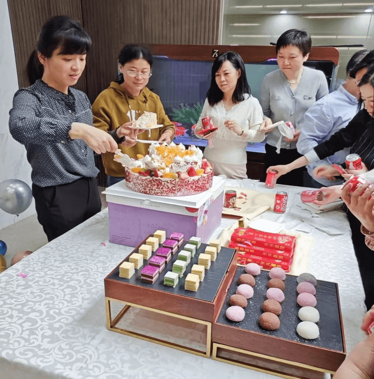 ↑集團(tuán)副總經(jīng)理潘麗女士和員工們一起分享“喬遷大喜”蛋糕